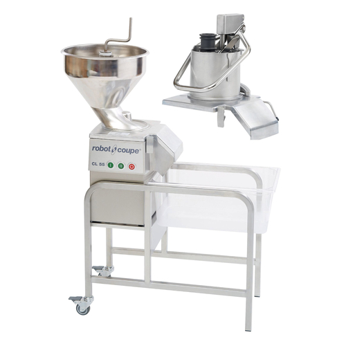 (CL 55 VV WORKSTN) Vegetable Preparation Machine, electric, (2) speeds, 4.2 litre capacity, stainless steel feed-head, magnetic safety system, includes: (3) slicers, (2) graters, (3) dicers, (2) julienne, 3″ H cart, 375 rpm, 1100 watts, 400v/50/3-ph (dimensions given with the stand)