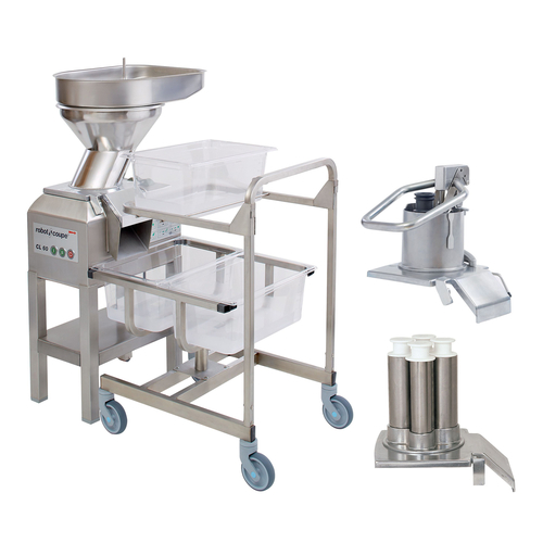 (CL 60 WORKSTN) Vegetable Preparation Machine, electric, (2) speeds, magnetic safety system, feed-head tilts in line with base, comes with (3) hoppers: bulk feed/control feed/4 hole hopper, Ergo mobile trolley complete with (3) gastronorm pans, (16) disc pack & 3mm potato ricer, (2) wheels and a handle, stainless steel base, 375/750 rpm, 1500 watts, 400v/50/3-ph, CE