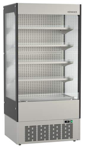 Open Multi-Deck Refrigerator with Black and Clear Glass End Panels, 65kg shelf load capacity (max), 970mm W x 750mm D x 2000mm H (height includes levelling feet), temperature range -1/+7°C, R290 refrigerant, shelf size: 1125mm W x 395 mm D, interior/exterior: stainless steel AISI 304, ventilated refrigeration system, air circulation system, night blind with soft close feature, replaceable side panels, tempered glass side panels in black, stainless steel adjustable shelf supports, shelves can be moved two levels up or down, (4) or (8) stainless shelves + bottom tray, (4) optional angle positions of shelves, LED lighting integrated at the back of each shelf, integrated levelling feet, 1.3kW, 230v/50, CE