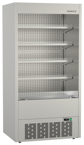 Open Multi-Deck Refrigerator with Solid End Panels, 65kg shelf load capacity (max), 1000mm W x 750mm D x 2000mm H (height includes levelling feet), temperature range -1/+7°C, R290 refrigerant, shelf size: 1125mm W x 395 mm D, interior/exterior: stainless steel AISI 304, ventilated refrigeration system, air circulation system, night blind with soft close feature, replaceable side panels, tempered glass side panels in black, stainless steel adjustable shelf supports, shelves can be moved two levels up or down, (4) or (8) stainless shelves + bottom tray, (4) optional angle positions of shelves, LED lighting integrated at the back of each shelf, integrated levelling feet, 1.3kW, 230v/50, CE