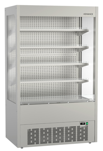 Open Multi-Deck Refrigerator with Clear Glass End Panels, 80kg shelf load capacity (max), 1200mm W x 750mm D x 2000mm H (height includes levelling feet), temperature range -1/+7°C, R290 refrigerant, shelf size: 1125mm W x 375 mm D, interior/exterior: stainless steel AISI 304, ventilated refrigeration system, air circulation system, night blind with soft close feature, replaceable side panels, tempered glass side panels in black, stainless steel adjustable shelf supports, shelves can be moved two levels up or down, (4) or (8) stainless shelves + bottom tray, (4) optional angle positions of shelves, LED lighting integrated at the back of each shelf, integrated levelling feet, 1.6kW, 230v/50, CE