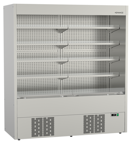 Open Multi-Deck Refrigerator with Solid End Panels, 60kg shelf load capacity (max), 1800mm W x 750mm D x 2000mm H (height includes levelling feet), temperature range -1/+7°C, R290 refrigerant, shelf size: 1415mm W x 395 mm D, interior/exterior: stainless steel AISI 304, ventilated refrigeration system, air circulation system, night blind with soft close feature, replaceable side panels, tempered glass side panels in black, stainless steel adjustable shelf supports, shelves can be moved two levels up or down, (4) or (8) stainless shelves + bottom tray, (4) optional angle positions of shelves, LED lighting integrated at the back of each shelf, integrated levelling feet, 1.8kW, 230v/50, CE
