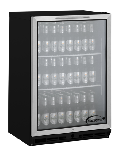 Back Bar Bottle Cooler, one-section, 600mm W, 850mm H, forced air, self-contained refrigeration, +4/+10°C temperature range, accommodates (94) 330ml bottle capacity, (1) double glazed glass door with barrel lock, (2) removable nylon coated wire shelves, CoolSmart controller for reduced energy consumption designed to operate efficiently up to a 32°C ambient, exceeding Climate Class 4, LED lighting, black exterior, stainless steel interior, R600a