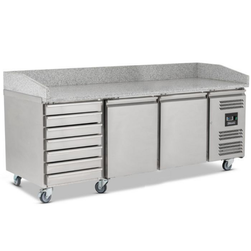 Blizzardâ„¢ Pizza Prep Counter, Stainless steel exterior & interior, White granite worktop, Internal corners rounded for easy cleaning, 15cm granite upstand, 2 adjustable shelves, Self closing doors, 7 x Neutral drawers perfect for storage of pizza dough, Heavy duty castors as standard, Digital temperature controller, Replaceable door gasket, Low profile integrated handles, Low impact branding