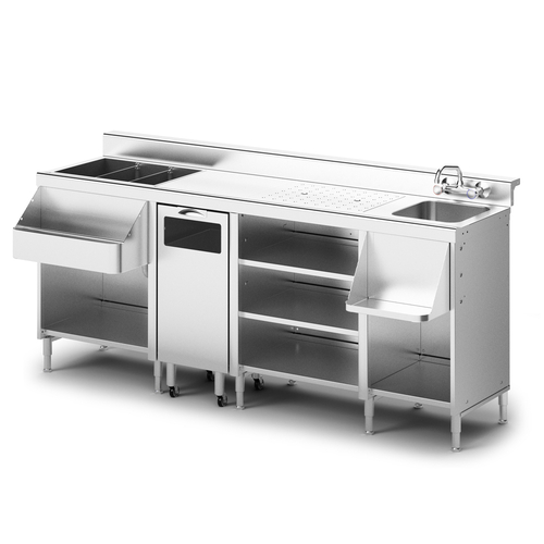 Bartender General Work Station, 2000mm L, single piece worktop design incorporating a ice chest, sink, waste unit, perforated worktop, & shelves, stainless steel construction
