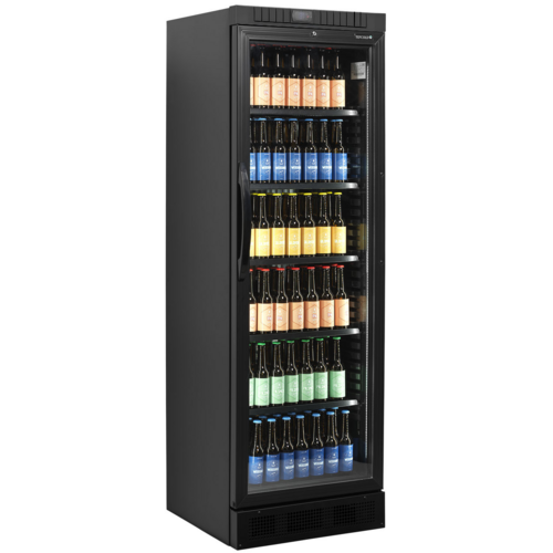 Glass Door Merchandiser, illuminated canopy, +2°C to +10°C temperature range, digital temperature display, lock, off cycle defrost, LED light in door frame, fan assisted cooling, reversible door (spare parts needed), black exterior finish, black interior finish, (4) adjustable shelves, R600a refrigerant, Climate Class: 4, Energy Rating: D, Energy Consumption: 821kWh per Annum, 13 amps (PROMO NET price until May 2025 and is only valid while stocks last)