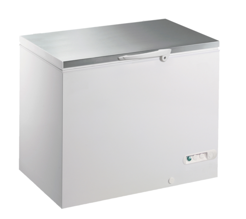 Advance Chest Freezer, 323 ltr. (gross) / 279 ltr. (net), stainless steel top with handle & lock, -22° to -14° C temperature range, defrost water drain, hammered aluminium interior, white exterior, white aluminium castors, R600a refrigerant, 230v/50/1-ph, 102 watts, MEPS C