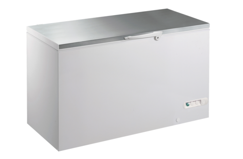Advance Chest Freezer, 491 ltr. (gross) / 426 ltr. (net), stainless steel top with handle & lock, -22° to -14° C temperature range, defrost water drain, hammered aluminium interior, white exterior, white aluminium castors, R600a refrigerant, 230v/50/1-ph, 173 watts, MEPS C