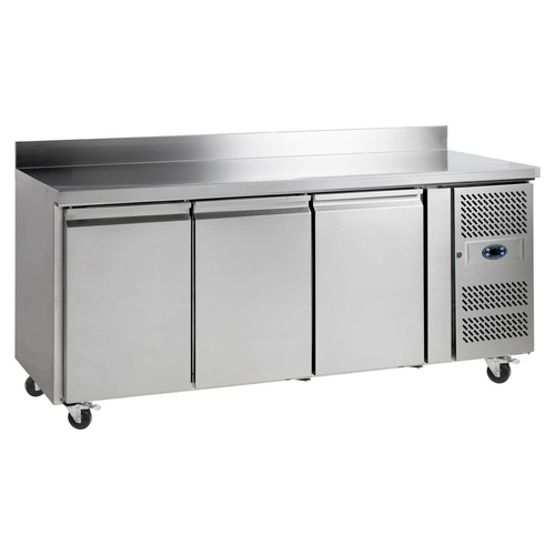 Tefcold® Refrigerated Counter, three-section, 1795mm W, 417 litre/14.7cu. ft. capacity, (3) doors & shelves, fitted splashback, -2° to +10°C temperature range, digital display/controls, adjustable temperature, automatic defrost, side mounted self contained refrigeration, stainless steel exterior & interior, fitted castors, R600a, 300 watts, MEPS B
