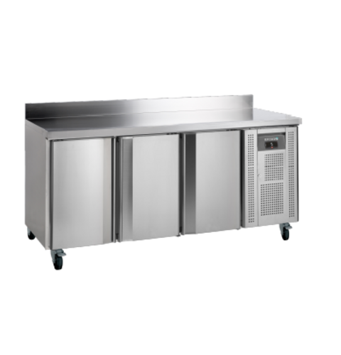 Gastronorm Counter Chiller, 1795 x 700 x 960mm, (3) GN1/1 cupboard sections, automatic defrost, -2°C to +8°C temperature range, digital controller and temperature display, ventilated cooling, (3) hinged self-closing doors, stainless steel top, splash-back, SS304 exterior and interior finish, (3) grey wire shelves, adjustable shelves, (4) adjustable legs, R600a refrigerant, Climate Class: 5, Energy Rating: A, Energy Consumption: 518Wh per Annum, 13 amps, 0.3 kWh. 220-240v/50/60Hz