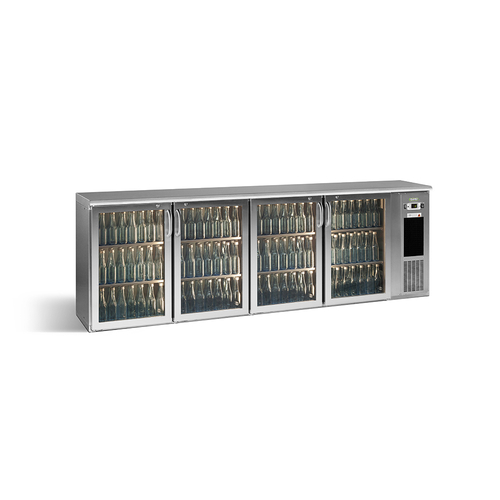Eco-Line Cooling Cabinet, undercounter, four-section, 2542mm W, 728 litre capacity, (722) 330 ml bottle capacity, (4) hinged glass doors with locks, digital thermostat, +2° C / +18° C temperature range, automatic defrost, silver coloured skin plate interior, (8) shelves, stainless steel exterior, 220-240v/50/1-ph, 235 watts, LED Lighting, Hydro Carbon