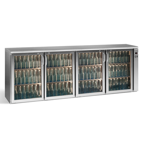Eco-Line Cooling Cabinet, undercounter, four-section, 2292mm W, 630 litre capacity, (722) 330 ml bottle capacity, (4) hinged glass doors with locks, digital thermostat, +1° C / +12° C temperature range, automatic defrost, silver coloured skin plate interior, stainless steel exterior, remote refrigeration, 220-240v/50/1-ph, 54 watts (supplied without condensing unit)
