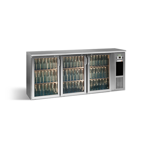 Eco-Line Cooling Cabinet, three-section, undercounter, 1988mm W, 537 litre capacity, (531) 330 ml bottle capacity, (3) hinged glass doors with locks, digital thermostat, +2° C / +18° C temperature range, automatic defrost, silver coloured skin plate interior, (6) shelves, full stainless steel exterior, 220-240v/50/1-ph, 230 watts, Hydro Carbon