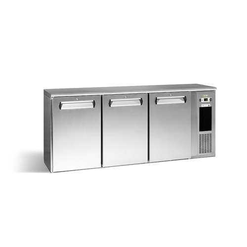 Eco-Line Cooling Cabinet, three-section, undercounter, 1988mm W, 537 litre capacity, (531) 330 ml bottle capacity, (3) hinged solid doors, digital thermostat, +2° C / +18° C temperature range, automatic defrost, silver coloured skin plate interior, (6) shelves, full stainless steel exterior, 220-240v/50/1-ph, 210 watts, Hydro Carbon