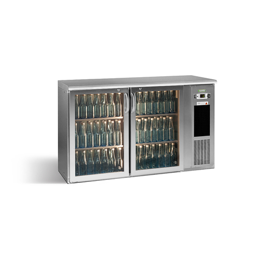 Eco-Line Cooling Cabinet, undercounter, two-section, 1434mm W, 364 litre capacity, (344) 330 ml bottle capacity, (2) hinged glass doors with locks, digital thermostat, +2° C / +18° C temperature range, automatic defrost, silver coloured skin plate interior, (4) shelves, full stainless steel exterior, 220-240v/50/1-ph, 278 watts, Hydro Carbon