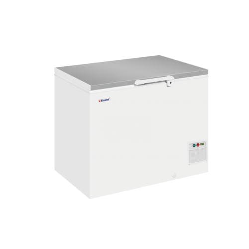 Chest Freezer, solid stainless steel 304 lid with lock (lid work surface), digital temperature display, static cooling, -23°C to -16°C temperature range, interior light, mains indicator light, white interior and exterior finish, (2) baskets, with feet, defrost drain, R600a refrigerant, Climate Class: 3, Energy Rating: C, Energy Consumption: 584kWh per Annum, 13 amps