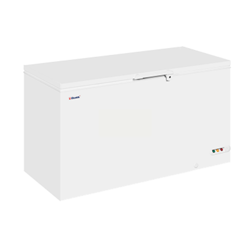 Elcold Chest Freezer, 1500mm W, 527 litre/18.6 cu meter capacity, (1) basket included, -18° to -22°C adjustable temperature range, static cooling, handle with lock, manual defrost with drain, interior light, mains indicator light, high temp warning light, fast freeze switch, bottom mounted compressor, white exterior, hammered aluminium interior, R600a, feet, 211 watts, Climate Class 3