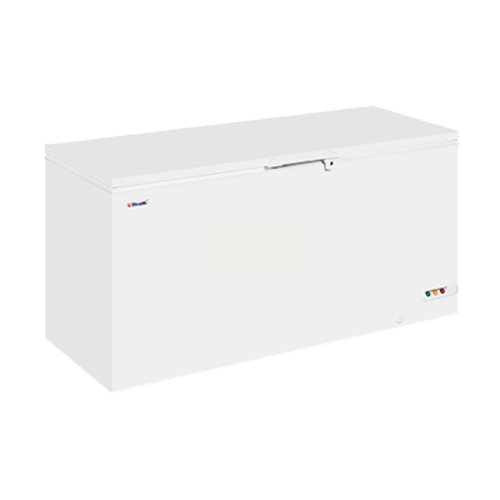 Elcold Chest Freezer, 1700mm W, 607 litre/21.4 cu .ft. capacity, (1) basket included, -18° to -22°C adjustable temperature range, static cooling, handle with lock, manual defrost with drain, interior light, mains indicator light, high temp warning light, fast freeze switch, bottom mounted compressor, white exterior, hammered aluminium interior, R600a, feet, 211 watts, Climate Class 3