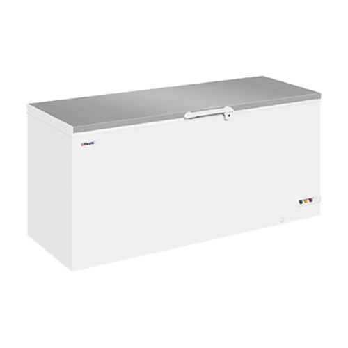 Elcold Chest Freezer, 1800mm W, 701 litre/24.7 cu .ft. capacity, (3) baskets included, -18° to -22°C adjustable temperature range, static cooling, handle with lock, manual defrost with drain, interior light, mains indicator light, high temp warning light, fast freeze switch, bottom mounted compressor, stainless steel lid, white exterior, hammered aluminium interior, R600a, feet, 245 watts, Climate Class 3
