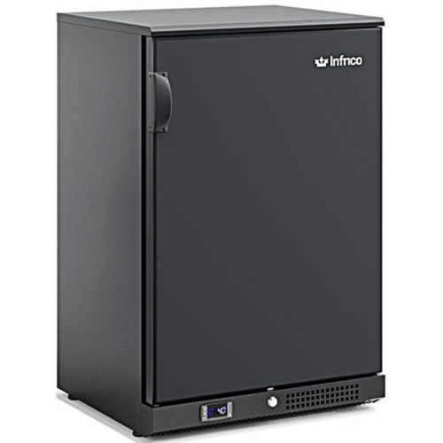 Infrico Bottle Cooler, Black plastic coated steel exterior, Grey plastic coated steel interior, LED lighting, Supplied with 2 plastic coated wire shelves, Locks as standard, Adjustable feet, Replaceable door gasket