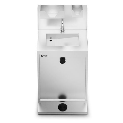 IMClean Junior Hand Wash Station, reduced height, (1) 345mm W x 220mm D sink bowl, provides 200 hand washes (20 litres per fill), internal waste collection, foot-operated pump, backsplash, space for soap dispenser & paper towels, stainless steel construction