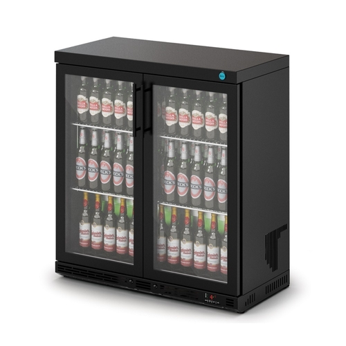 IMC Ventus V90 Bottle Cooler, 900mm W x 900mm H, reach-in, two section front-loading, (2) full front glass hinged doors, (195) bottle capacity, stainless steel interior, LED lighting, (2) shelves included, black painted exterior, rear mounted self-contained refrigeration, R290, 0.393kW, 240v/50/1-ph, 1.64 amps, cord & plug, IPX1