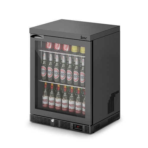 IMC Mistral M60 Bottle Cooler, 600mm W, front loading, reduced height, (78) bottle capacity, right hinged reversible glass door, (2) shelves, LED light, black exterior, self contained bottom mount refrigeration, R290a, 0.23kW, 240v/50/1-ph, 1.65 amps, cord & plug, IPX1