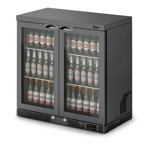 IMC Mistral M90 Bottle Cooler, 900mm W, front loading, (195) bottle capacity, (2) glass doors, (2) shelves, LED light, black exterior, self contained bottom mount refrigeration, R290a, 0.23kW, 240v/50/1-ph, 1.72 amps, cord & plug, IPX1