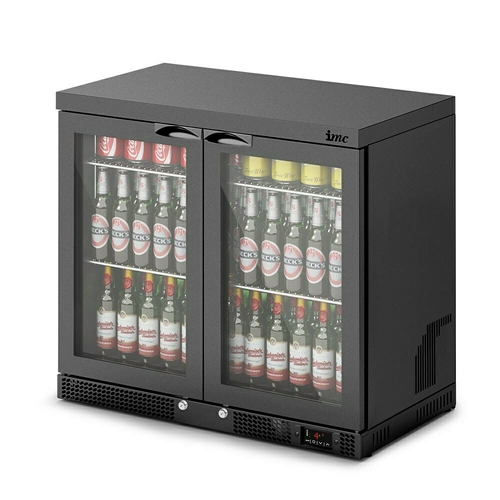 IMC Mistral M90 Bottle Cooler, 900mm W, front loading, reduced height, (117) bottle capacity, (2) glass doors, (2) shelves, LED light, black exterior, self contained bottom mount refrigeration, R290a, 0.23kW, 240v/50/1-ph, 1.72 amps, cord & plug, IPX1
