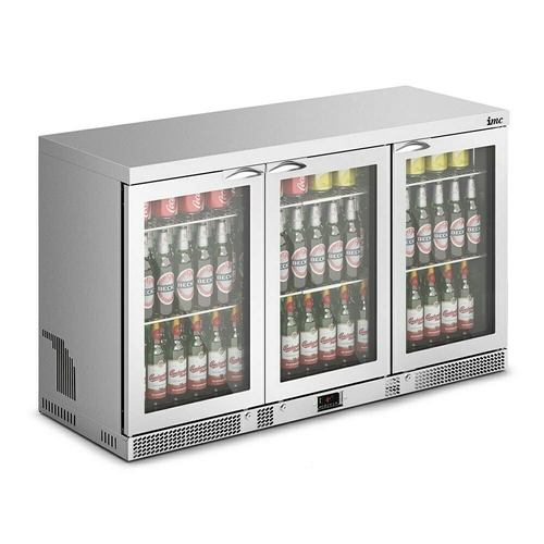 IMC Mistral M135 Bottle Cooler, 1350mm W, front loading, reduced height, (185) bottle capacity, (3) glass doors, (2) shelves, LED light, stainless steel exterior, self contained bottom mount refrigeration, R290a, 0.36kW, 240v/50/1-ph, 2.79 amps, cord & plug, IPX1