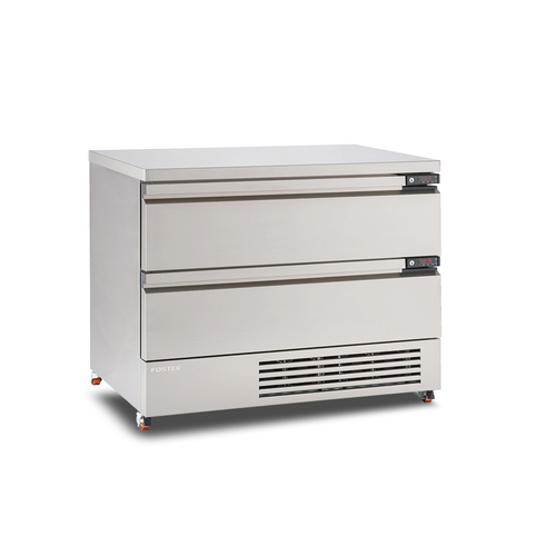 FFC6-2 Foster FlexDrawer Counter, change individual drawer temperature from fridge to freezer at the touch of a button, (2) multiple temperature drawers (refrigerator +1/+4°C or freezer -18/-21°C), (6) GN1/1 150mm deep pan capacity (pans not included), 304 stainless steel finish throughout, fully removable robust ABS drawer bins, lockable drawers, user friendly controls with LED temperature display, R290 Hydrocarbon refrigerant, automatic energy saving hot gas defrost, operates to ISO Climate Class 5 – up to 43°C ambient, add 20mm to depth if product is to be wall-sited (stopper required for air circulation – detachable if not wall-sited), MEPS B