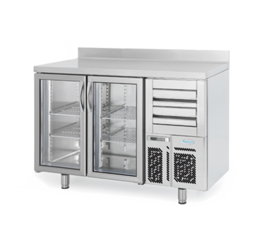 Infrico Tall Back Bar Counter, High grade AISI 304 stainless steel exterior & interior, Supplied with 2 shelves per door 325 x 430mm, 2 neutral drawers above unit compartment, Adjustable legs, 100mm cover upstand, Vertical LED illumination, Replaceable door gaskets