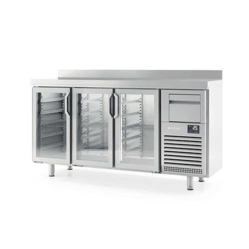 Infrico Tall Back Bar Counter, High grade AISI 304 stainless steel exterior & interior, Supplied with 2 shelves per door 325 x 430mm, 2 neutral drawers above unit compartment, Adjustable legs, 100mm cover upstand, Vertical LED illumination, Replaceable door gaskets