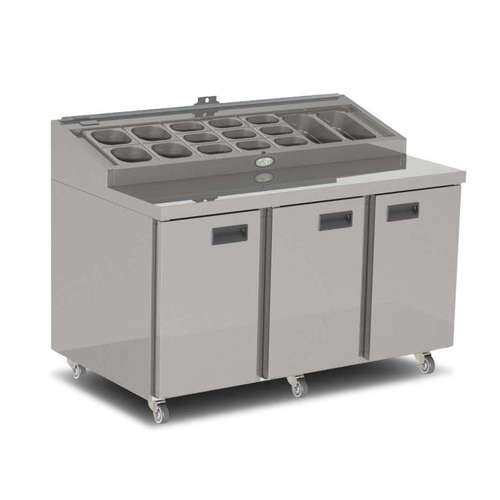 FPS1/3HR-101 Prep Station Refrigerated Counter, three section, 440 litre, (7) 1/3 GN capacity raised pan rail (pans not included), (6) GN 1/1 shelves, high grade 304 stainless steel work surface, stainless steel exterior, aluminium interior, (+1°/+4° C) ergonomic door handle, LED temperature display, (3) solid doors, castors, rear mount self-contained refrigeration