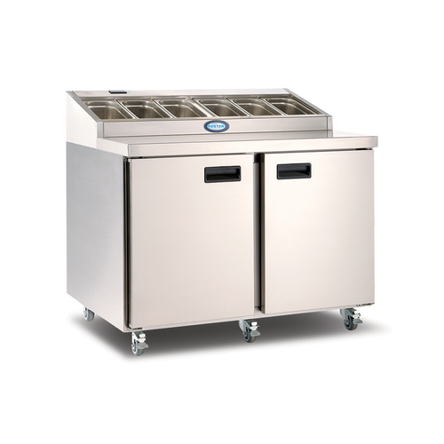 FPS2HRSA Prep Station Refrigerated Counter, two section, 270 litre, (6) 1/3 GN capacity raised pan rail (pans not included), (4) shelves, high grade 304 stainless steel work surface, stainless steel exterior, aluminium interior, (+1°/+4° C) ergonomic door handle, LED temperature display, (2) solid doors, (4) lockable castors, rear mount self-contained refrigeration