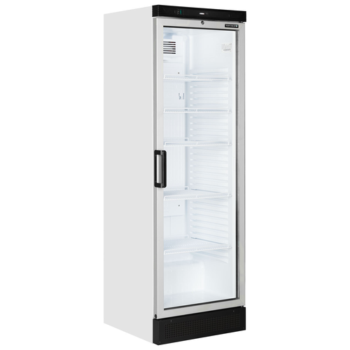 Tefcold® Refrigerated Merchandiser, one-section, 595mm W, 372 litre/13.1 cu. ft. capacity, (1) right hand hinged lockable reversible glass door with silver frame, replaceable door gasket, (5) adjustable wire shelves white, +2°C to +10°C, adjustable temperature, off cycle defrost, temperature display, white interior, LED interior lighting, white exterior finish, fan assisted cooling, bottom mounted self-contained refrigeration, adjustable feet, R600a, 295 watts, MEPS D
