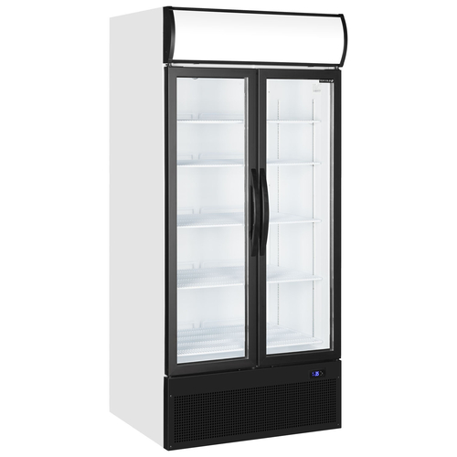 Tefcold® Refrigerated Merchandiser, two-section, 890mm W, 707 litre/24.96 cu. ft. capacity, (2) self-closing hinged glass doors with black frame, (4) adjustable shelves + base shelf, +2°C to +10°C, adjustable temperature, fan assisted cooling, automatic defrost, digital display, LED interior lighting, white interior & exterior finish with lighted canopy, fan assisted cooling, bottom mounted self-contained refrigeration, adjustable feet & rollers to rear, R290, 410 watts, MEPS G