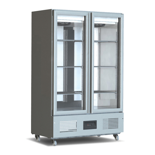 FSL 800H-SA Slimline Refrigerator, reach-in, 800 litre, two-section, (6) shelves, full height glass door, stainless steel exterior, aluminium interior (+1°/+4°C), ergonomic full height door handle, forced air refrigeration system will operate up to 40°C (ISO Climate Class 5), LED temperature display, (4) lockable castors, bottom mounted self-contained refrigeration system