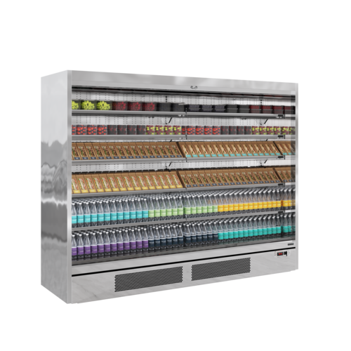 Multideck, fully automatic, fan assisted cooling, Horizontal LED lighting, Solid 40 mm endwalls with mirrored interior, Soft closing nightblind, 5 AdjusTABLE shelves, max weight 160kg/sq metre, Shelves can be flat or angled to 7° or 14°, EPOS Ticket strips & shelf risers, SuiTABLE for fresh meat, Can be multiplexed with kit (POA), Exterior Finish: Mirror Stainless Steel, Interior Finish: Mirror Stainless Steel, Net Weight: 430kg”, automatic defrost type, R290 Refrigerant, Climate Class: 3Energy Rating: E,Energy Consumption: 10793kWh per Annum, 16 amps