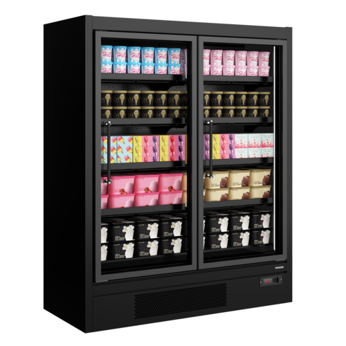 Glass Door Freezer, fully automatic, fan assisted cooling, AdjusTABLE shelves, AdjusTABLE feet, Vertical LED interior light with switch, Thermometer, Replaceable door gasket, Epos Ticket Strips, Heated glass door to prevent condensation, Triple glazed insulated glass, Exterior Finish: BLACK RAL9005, Interior Finish: BLACK (RAL9005), Net Weight: 463kg”, automatic defrost type, hot gas, R290 Refrigerant, Climate Class: 3, Energy Rating: D, Energy Consumption: 7337kWh per Annum, 16 amps