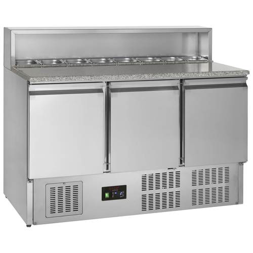 Refrigerated Preparation Counter, 1365mm W, adjustable shelves, granite worktop, 1/1 gastronorm cupboards, topping unit accepts (5) 1/6GN pans, digital controller & display, +2° to +10°C, adjustable temperature range, fan assisted cooling, automatic defrost, side mounted self contained refrigeration, stainless steel exterior & interior, lockable castors, R600a, 13 amp (Web Deal Price is available until the 31st January 2026 whilst stocks last, when you place your order directly through the TEFCOLD website only)