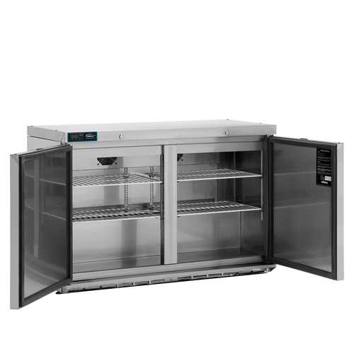 Amber Undercounter Refrigerator, reach-in, two-section, 1210mm W, front vented self-contained refrigeration, 267 litre capacity, +1/+4° C temperature range, (2) solid doors with magnetic balloon gaskets, barrel locks, (4) nylon coated adjustable wire shelves, designed to operate efficiently up to 32° C ambient, CoolSmart controller for reduced energy consumption, aluminium interior, stainless steel exterior, R290 MEPS C, CE