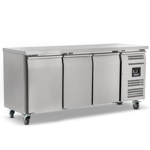 Blizzardâ„¢ Gastronorm Refrigerated Counter, Stainless steel exterior & interior, Even air distribution by ducted system, Self closing doors with dwell position, Replaceable door gaskets, Available with 2 or 3 drawer option, Lockable heavy duty castors as standard, Internal corners rounded for easy cleaning, 3 Adjustable shelves, Digital temperature controller, Low profile integrated handles, Low impact branding