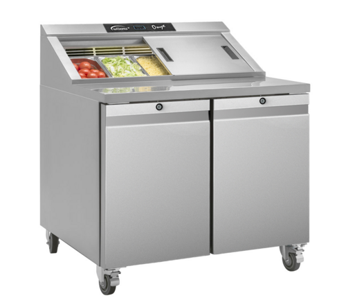 Onyx Refrigerated Salad Prep Counter, three-section, 955mm W, accommodates (4) 1/3 GN pans (not included), +1/+4° C temperature range, (2) self-closing solid doors with barrel locks, (4) shelves, unique airflow design with protective 1° C air curtain, designed to operate efficiently up to a 43° C ambient, removable easy to clean crumb tray, lift off night cover, food safe stainless steel interior & exterior, HD non-marking swivel castors with brakes, Out of Scope, R290