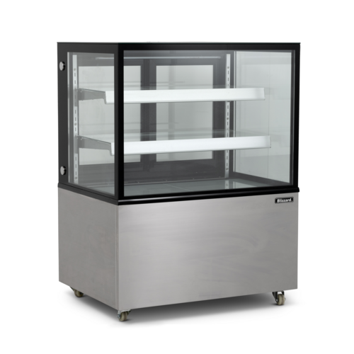 BLIZZARD Heated Display Merchandiser, 1500mm W x 675mm D x 1200mm H, stainless steel construction, flat double glazed glass structure, (2) adjustable glass shelves, temperature range +60°C to +70°C, under lit LED shelves, included pricing strips, rear double sliding glass door, 4 low profile castors (2 braked), rear vented design, digital temperature controller, 13amp