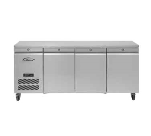 Jade Slim Line Refrigerated Counter, reach-in, three-section, side mount self-contained refrigeration (removable), 1880mm W, 374 litre capacity, +1° C/+4° C temperature range, (3) self-closing doors with magnetic balloon gaskets, barrel locks, (2) 2/3 GN shelves per section, Coolsmart controller for reduced energy consumption, designed to operate efficiently up to a 43° C ambient, polyurethane insulation, aluminium interior, stainless steel exterior, HD non-marking swivel castors with brakes, R290 MEPS B