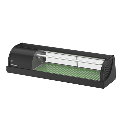 HNC Series Sushi Case, 1200mm, left side compressor, black finish, with LED light, curved glass with antiscattering film, (2) sliding doors, 42 litres capacity, top glass angles down providing 1700mm plate space on top of unit, stainless steel and glass construction, electronic control, self-contained R600a refrigeration, 220-240v/50/1-ph