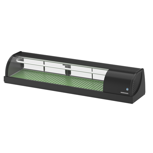 HNC Series Sushi Case, 1500mm, right side compressor, black finish, with LED light, curved glass with antiscattering film, (2) sliding doors, 57 litres capacity, top glass angles down providing 1700mm plate space on top of unit, stainless steel and glass construction, electronic control, self-contained R600a refrigeration, 220-240v/50/1-ph