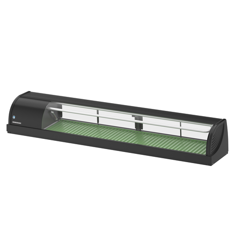 HNC Series Sushi Case, 1800mm, left side compressor, black finish, with LED light, curved glass with antiscattering film, (2) sliding doors, 72 litres capacity, top glass angles down providing 1700mm plate space on top of unit, stainless steel and glass construction, electronic control, self-contained R600a refrigeration, 220-240v/50/1-ph