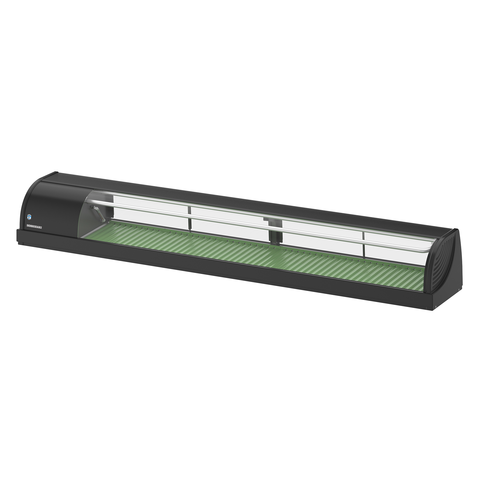 HNC Series Sushi Case, 2100mm, left side compressor, black finish, without LED light, curved glass with antiscattering film, (2) sliding doors, 87 litres capacity, top glass angles down providing 1700mm plate space on top of unit, stainless steel and glass construction, electronic control, self-contained R600a refrigeration, 220-240v/50/1-ph, 0.155 kW
